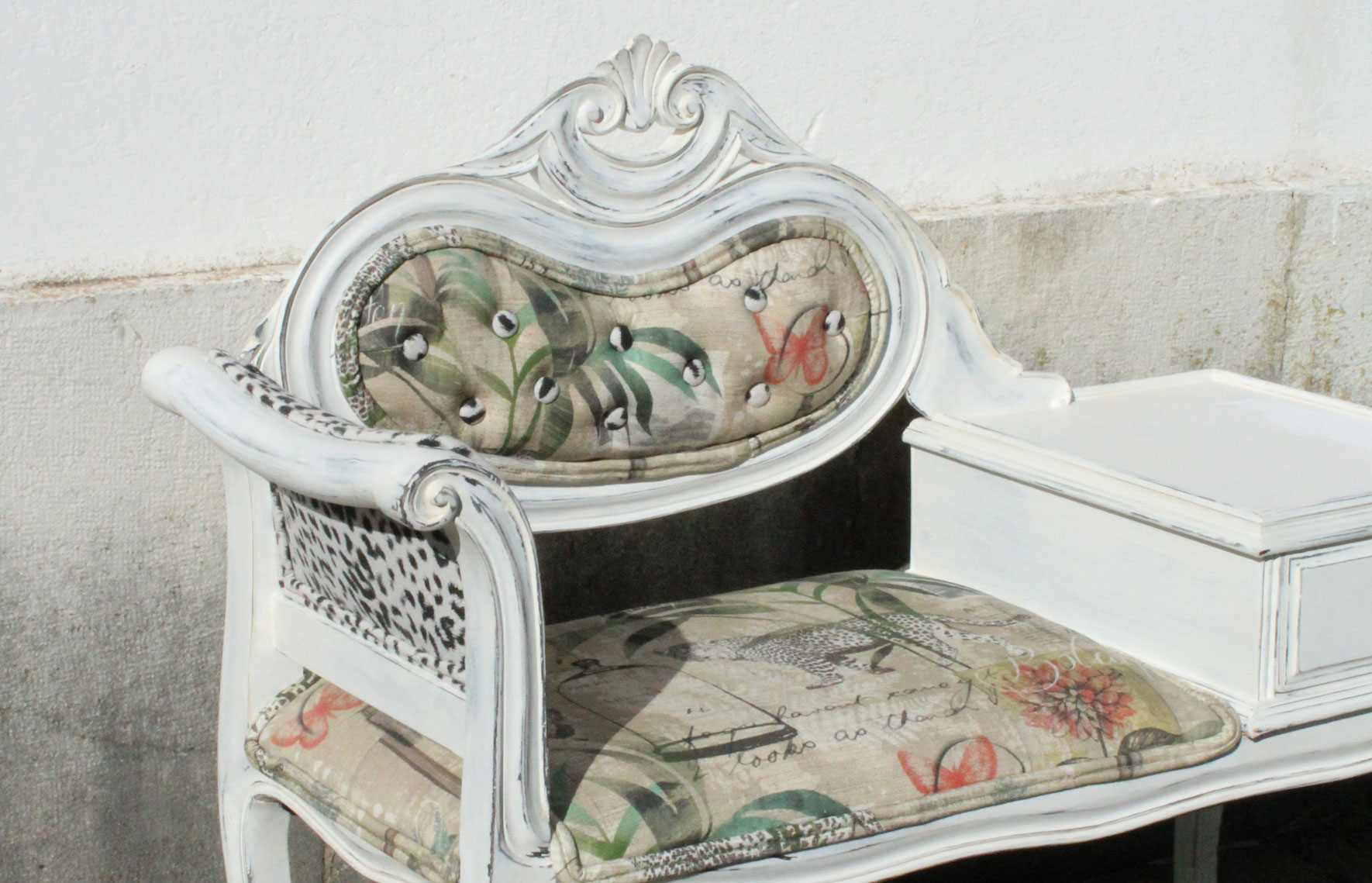 Dois tecidos diferentes mas que se completam. Botonê no encosto, técnica muito explorada nas décadas de 50 e 60.